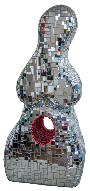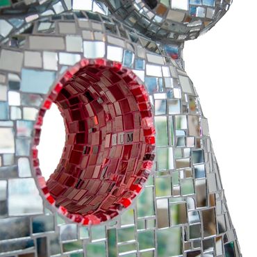 The head armature is a combination between ant- lers and wings serving as strength, protection, courage, and freedom. FearLess is made of Italian glass tiles & Smalti, mirrors, cedar wood, rebar, mixed media, and a watch which is set at 11:11 along with the "Circles of Life".