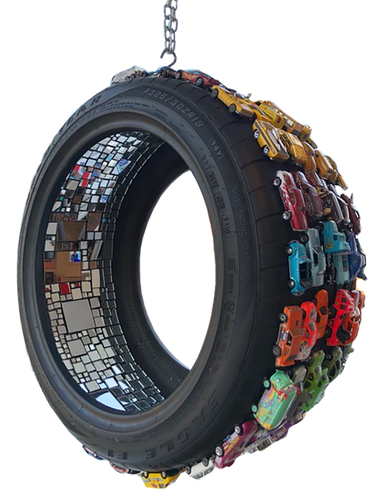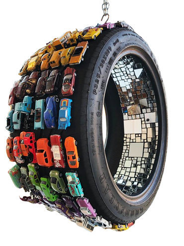 This classic contemporary art piece is created with over forty years of collected Match Car and Hot Wheels cars, trucks, vans and more. The inner rim of this high performance Goodyear tire sculpture is filled with mirrored mosaic tiles, creating a dramatic reflective effect. The piece suspends from the top by sturdy 8ft adjustable chainlink and would be a perfect addition to any art collection.